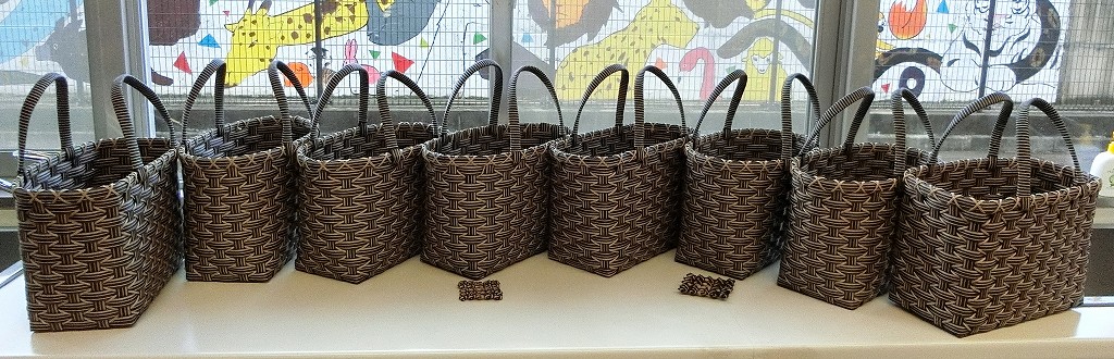 完成したばかりの再生紙を使った環境に優しいカゴバックで、皆さんは何を入れ、どこにお出かけされるのでしょうか。ぜひ、たくさん使っていただき、楽しい思い出を増やしていただきたいと思います。