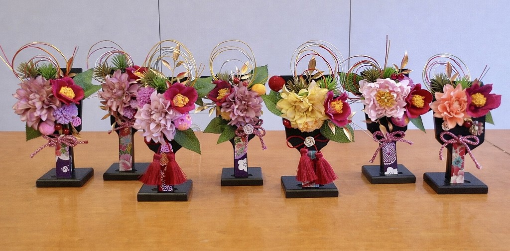 今回は、新春にふさわしい「羽子板飾り」を作りました。大牟田市の花である「椿」や縁起ものである「松」、「水引」など、先生の指導のもと、好みの色を選び、各パーツの配置を選択していただき、とても素敵な新春の羽子板を作ることができました。