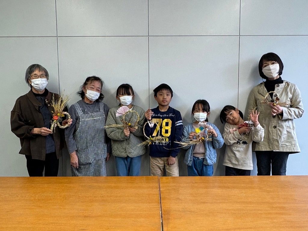 しめ縄の土台になる稲藁に、クチナシや松ぼっくり、金柑、バラの実などの自然の植物と色とりどりの水引や折り紙、モールを使って可愛らしい小さめのしめ縄を作りました。皆さん、先生の指導の元、無言になるほど、集中し、一生懸命な様子でした。