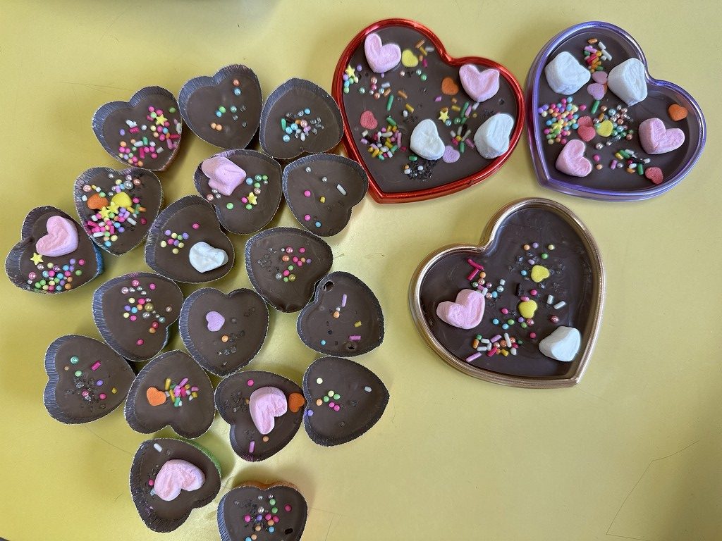 今回のバレンタインお菓子作りでは、チョコレートを溶かし、型に流しいれて飾りを行いました。用意した飾りを見て、どのように飾るか思い描いて(設計図を描いて)いただき、実際にチョコを溶かして作りました。男の子も女の子も真剣にバレンタインチョコを作り、最後には残ったチョコレートをなめてみたりと楽しんでいました。